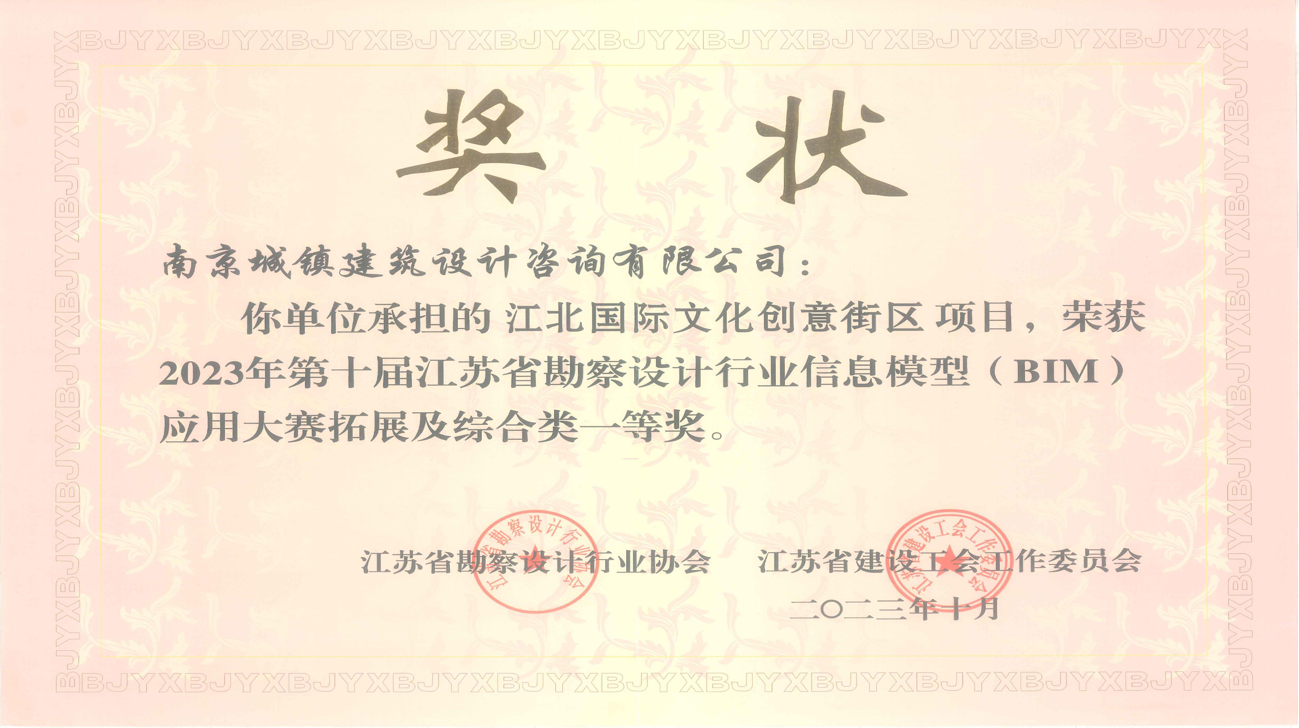 The Jiangbei International Cultural and Creative Block project undertaken by our company won the first prize of the extended comprehensive category of 2023 Jiangsu Survey and Design Industry Information Model (BIM) Application Competition.